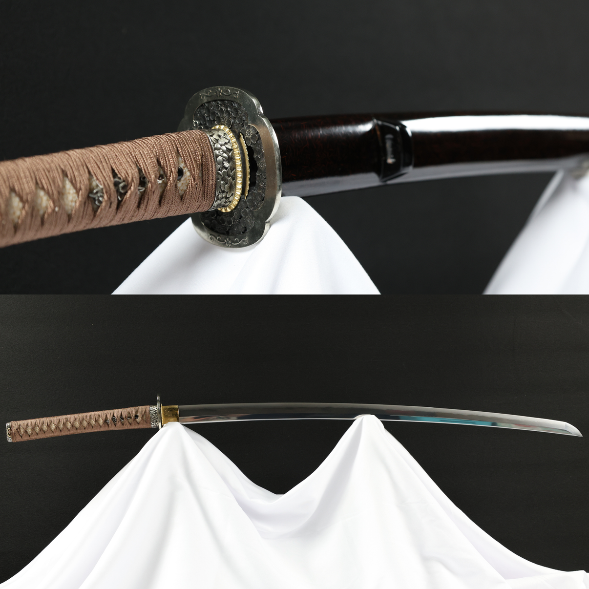 - Handle Wrapping (柄巻): Brown silk (or cotton) tsuka-ito, tightly wrapped over hishigami for clean, uniform diamonds.