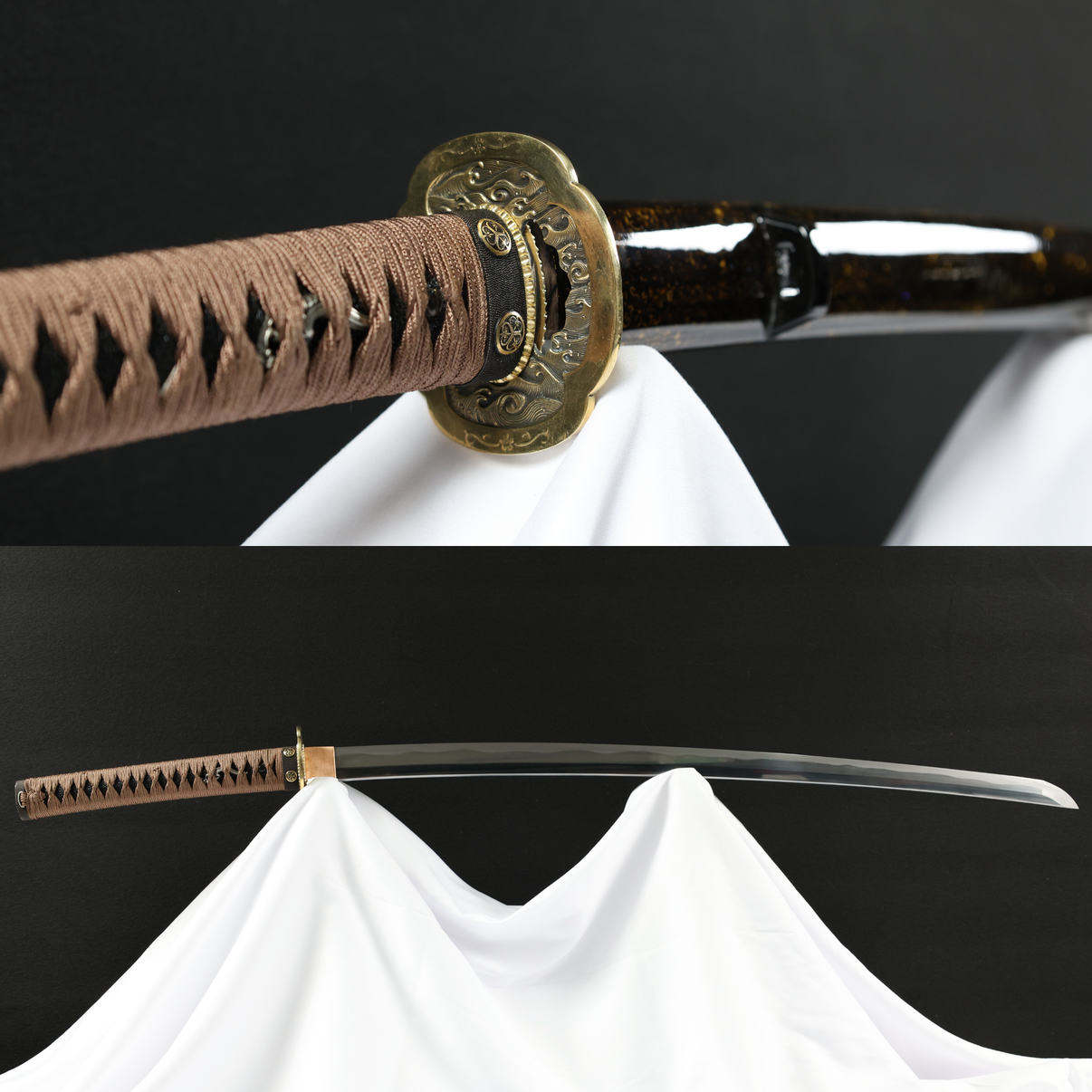 This katana, named Tidebreaker, is mounted in Shioban Koshirae(潮波拵). The blade is forged in Sanmai(三枚構造) construction, placing a hardened steel core between softer outer layers for strength, durability, and balanced cutting performance. It is clay tempered(覆土焼入れ), forming a flowing Notare-style hamon(のたれ刃文) along the edge. The surface shows Masame-hada mixed with Itame-hada(柾目肌交板目肌), combining straight and wood-grain patterns that reflect refined folding workmanship. The saya(鞘) is finished in Kin Mushikui lacquer(金虫喰塗), featuring a distinctive gold-speckled texture that shimmers subtly under changing light. The koiguchi(鞘口), kurigata(栗形), and kojiri(鐺) are reinforced with water buffalo horn(牛角). The tsuka(柄) is wrapped in brown ito(茶色柄糸) over black samegawa(黒鮫皮), with hishigami(菱紙) inserted to create crisp and uniform diamond patterns. The fuchi-kashira(縁頭) are blackened brass(煮黒真鍮) crafted in nanako-ji texture(魚子地) and engraved with traditional family crest motifs(家紋彫り / Kamon-bori). The tsuba(鍔) is a mokko-gata brass guard(木瓜形真鍮鍔) engraved with flowing wave motifs(波紋図), symbolizing the sea, movement, and harmonious strength. The habaki(鎺) is polished brass(真鍮) with a smooth finish, completing the elegant maritime-themed mounting.