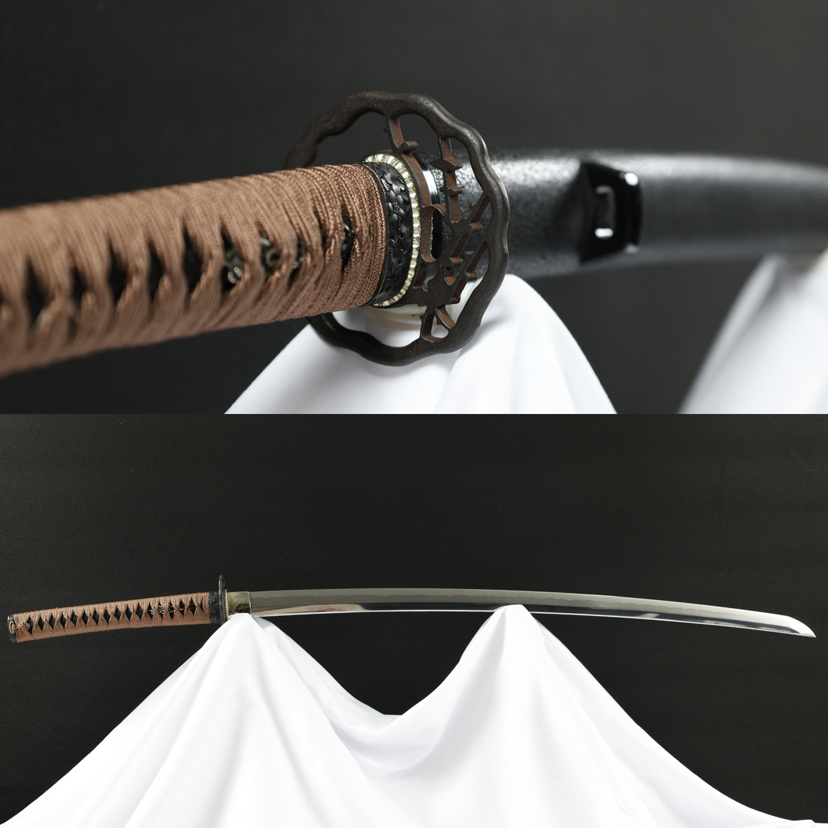 • Handle Wrapping (柄巻): Brown silk (or cotton) tsuka-ito, tightly wrapped over hishigami for clean, uniform diamonds.